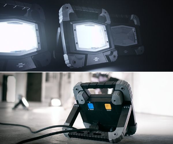 内置锂离子电池,支持充电宝功能,亮度 3800 流明,防护等级 IP55,无外接电源时也能稳定工作; - 带额外插座:移动式 LED 泛光灯 TORAN 5050 MB