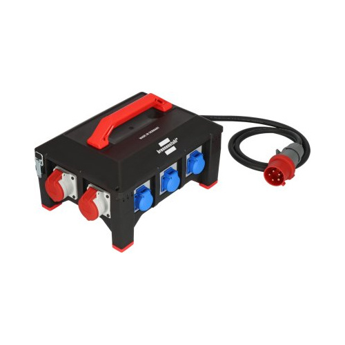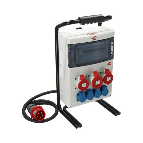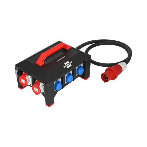 便携式建筑工地电流分配器,防护等级 IP44,内置 B 型 FI 保护开关(触发电流 30mA),配备 2 米 H07RN-F 型 5 芯 6.0mm² 线缆,含 1 个 32A 接口与 2 个 16A 接口,轻便易携带,适配中小型工地局部供电需求